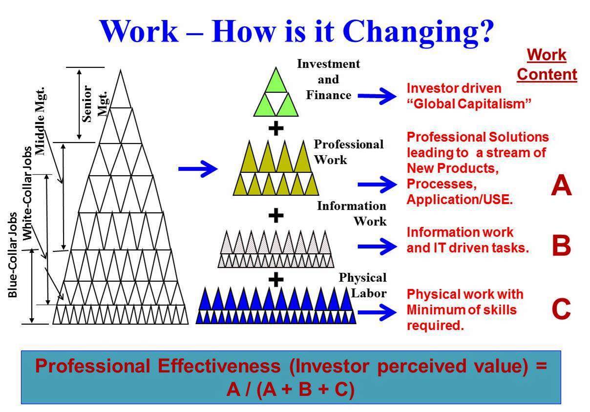 This brings us to the last group – the professionals. There were the days where the professional invented one new product or had the tricks up the sleeve for one process or some special know-how. Since it was in his/her head or in the private file folders, investors needed them for life time. Not anymore. As soon as they have documented their idea, it is available for everyone to use, across the globe, thanks to Digital Technology enabled capabilities. They need to start on the next one and continue this chase relentlessly. Their economic future will largely depend on: do they choose to be passionate to identify and create and implement a relentless stream of new solutions? We call this passion and the skills required for that as the Transformational Skills. If yes, they will be seen as valuable by the investors and hence may continue to climb the economic ladder. Or, do they choose to be a one trick pony and after that merely take orders and carry out assigned tasks? If yes, they will be mercilessly pushed into the category of low wage information workers, consistent with their low value addition. Investors will have no mercy for their economic wellbeing. It is only rational and consistent with the basic principle of classical economics: People behave in their own economic self-interest.