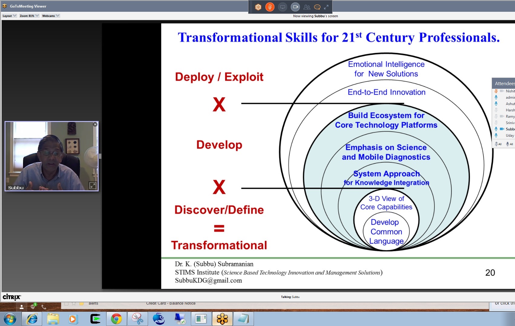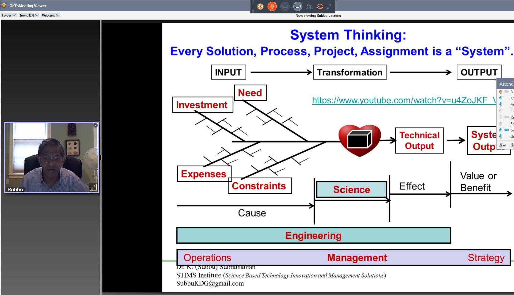 TOPIC – Systems Thinking and Transformational skills  SPEAKER – Dr. K. Subramanian, President, STIMS Institute    DATE – 28TH March 2015   ATTENDEES :   Name removed for privacy; Attendees from: USA, India, Dubai