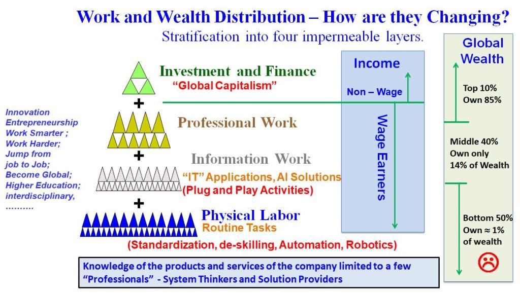 - Work and wealth Distribution are radically changing. Be aware and get prepared for it. Learn to swim through this sea change! The layers of work are increasingly separate, opaque and impermeable. The opportunity to grow from one layer of work to the next and thus climb the organizational hierarchy may no longer be valid.