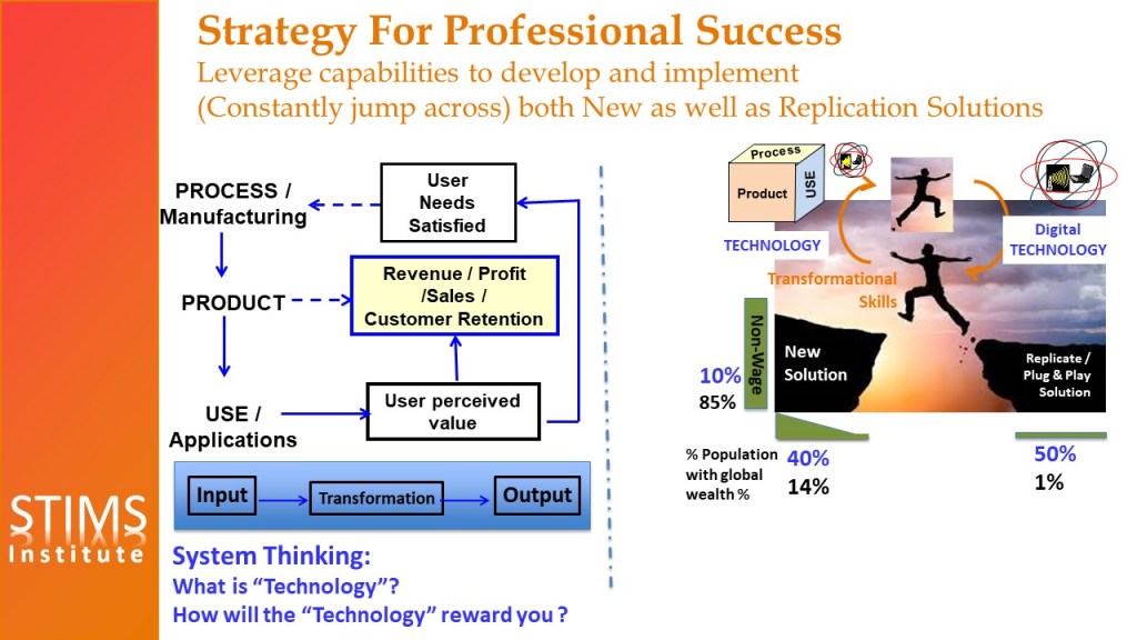 - Growth in job and career is no longer a matter of how long you worked in a company, job or field of activity. See point 1 above and the impermeable layers in the figure. Every professional at every level of their job or career needs to be focussed on life long learning, contributing through a relentless stream of new solutions. Transform any job / assignment (activity) into a series of goals and their impact. In turn pave the way for the means necessary for sustainability. These are the outcomes of System Thinking and Transformational Skills. Practice them relentlessly together with your academic education and industry/domain specific learning.